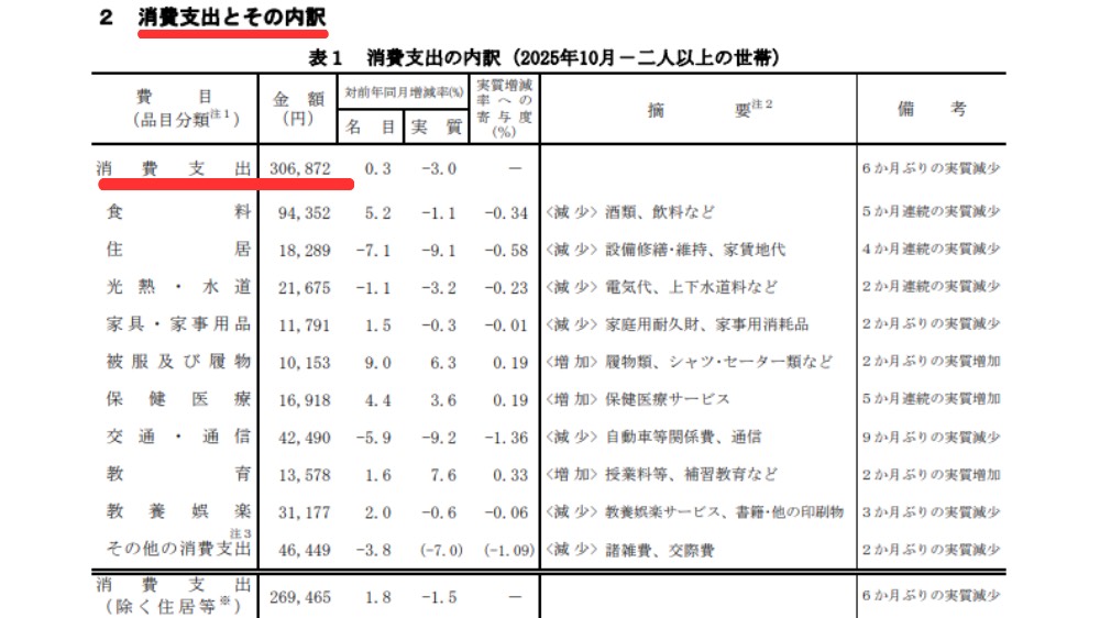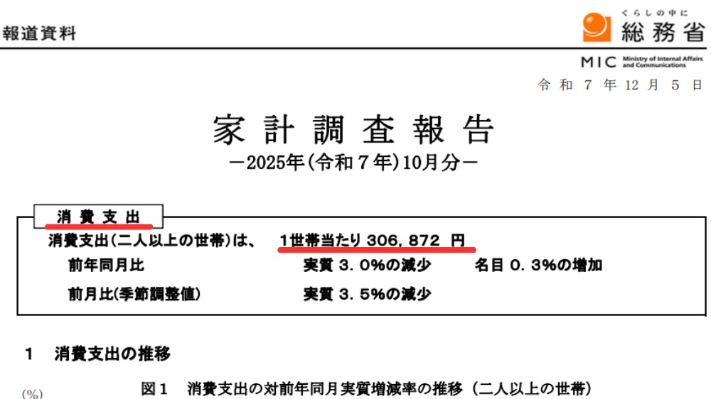 上記の画像でいうと、「2025年10月の、国内の、2人以上世帯の消費額の平均は、約30.7万円だった(千円未満切り上げ)」ということがわかります。